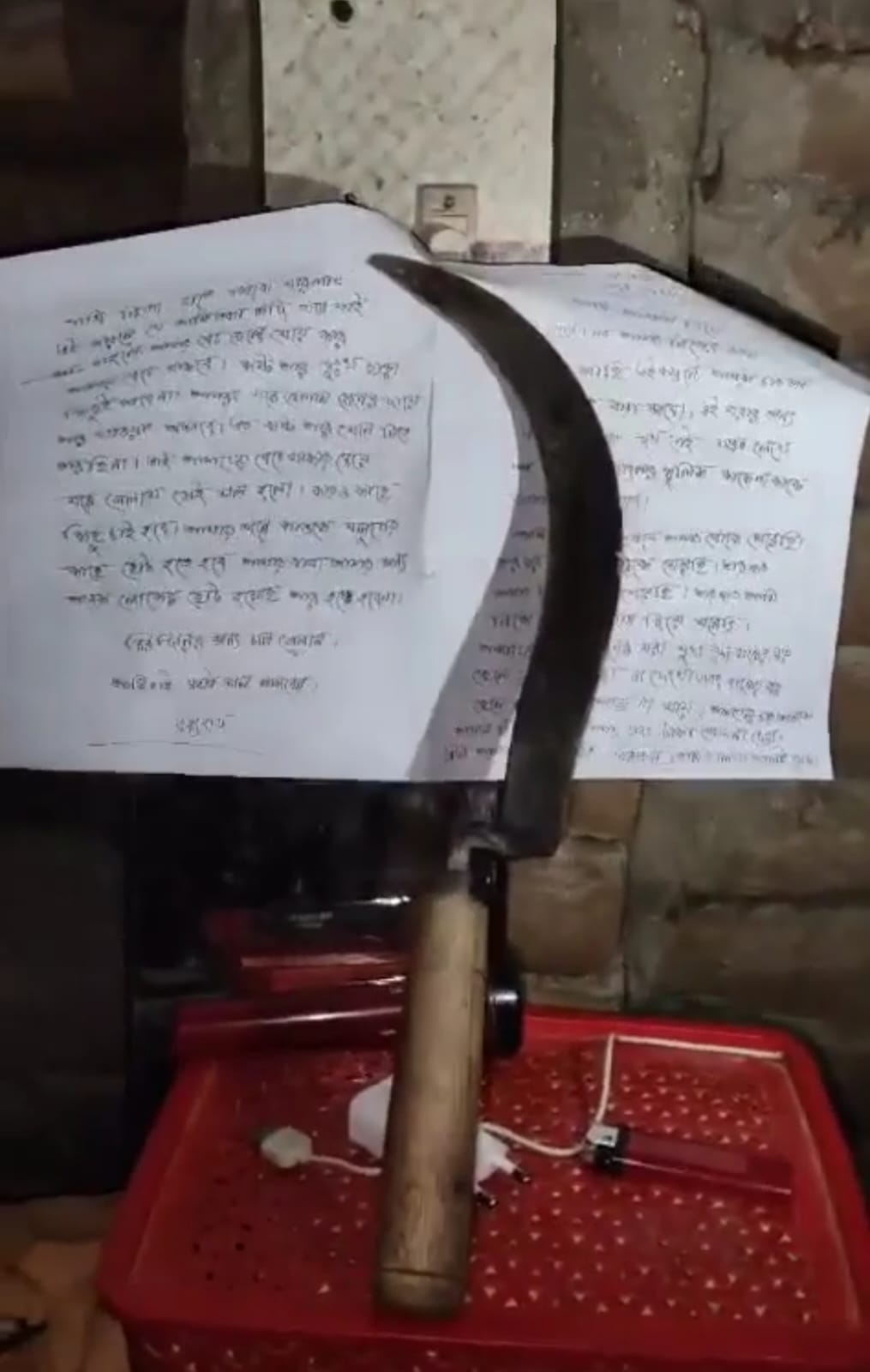 আমি পিয়ারুল প্রথমে আমার বোকে (বৌকে) মেরেছি। তারপর আমার মাহিনকে (ছেলেকে) মেরেছি। তারপর আমার মিথিলাকে (মেয়েকে) মেরেছি। তারপর আমি নিজে গলাতে ফাস দিয়ে মরেছি। আমাদের চার জোনের মরা মুখ যেন বাপের বড় ছেলে ও তার বো (বৌ) বাচ্চা না দেখে। এবং বাপের বড় ছেলে যেনো জানাজায় না যায়। আমাদের চারজনকে কাফন দিয়ে ঢাকতে আমার বাবা টাকা যেন, না দেয়। এটা আমার কসম ( ইতি মিনারুল) আছছালামু আলাইকুম।
