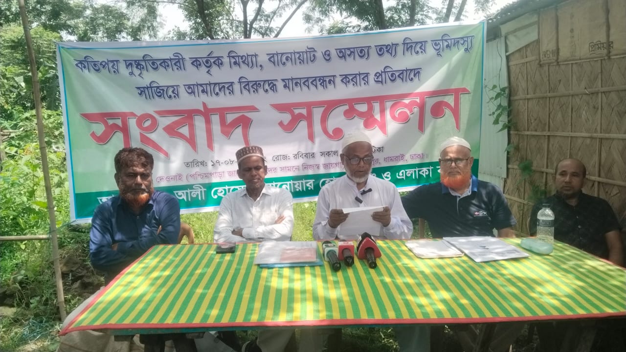 ঢাকার ধামরাই উপজেলার সানোড়া ইউনিয়নের দেওনাই গ্রামে কতিপয় দুষ্কৃতকারী কর্তৃক মিথ্যা বানোয়াট ও অসত্য তথ্য দিয়ে ভূমিদস্যু সাজিয়ে মানববন্ধন করার প্রতিবাদে সংবাদ সম্মেলন করেছেন এক ভুক্তভোগী পরিবার।