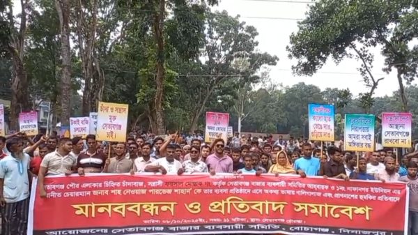 মানববন্ধ ও বিক্ষোভ সমাবেশে সেতাবগঞ্জ ব্যবসায়ী সমিতির আহবায়ক শাহ নেওয়াজ পারভেজ শাহানের সভাপতিত্বে শতশত ব্যবসায়ীদের মধ্যে বক্তব্য রাখেন ব্যবসায়ী রুবেল, ইমরুল, রেজা, আলমগীর শাহ,মাসুদ খাঁন,স্বাধীন প্রমুখ।
