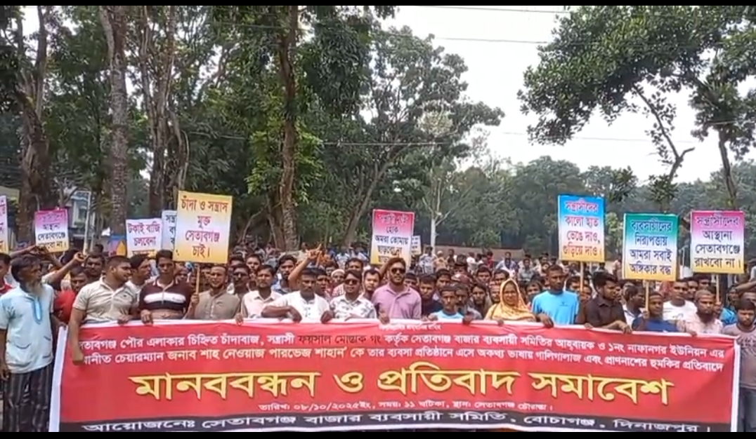 দিনাজপুরের বোচাগঞ্জ উপজেলার সেতাবগঞ্জ বাজার ব্যবসায়ী সমিতির আহবায়ক ও ১নম্বর নাফানগর ইউনিয়নের চেয়ারম্যান শাহ নেওয়াজ পারভেজ শাহানকে অকথ্য ভাষায় গালিগালাজ এবং প্রাণনাশের হুমকি প্রদানের প্রতিবাদে মানববন্ধ ও বিক্ষোভ সমাবেশ। এলাকার চিহ্নিত চাঁদাবাজ ও সন্ত্রাসীদের গ্রেফতারের দাবীতে স্মারকলিপি প্রদান করে সেতাবগঞ্জ বাজার ব্যবসায়ী সমিতি।