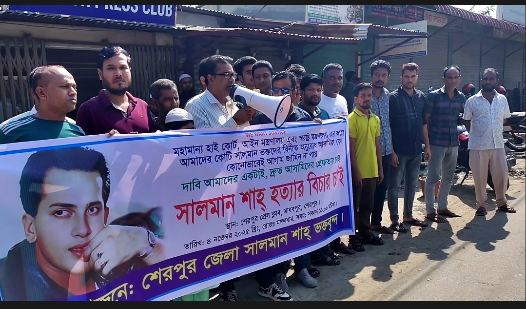 ৪ নভেম্বর মঙ্গলবার সকালে শেরপুর প্রেসক্লাব এর সামনে এ মানববন্ধন কর্মসূচি পালন করা হয়।