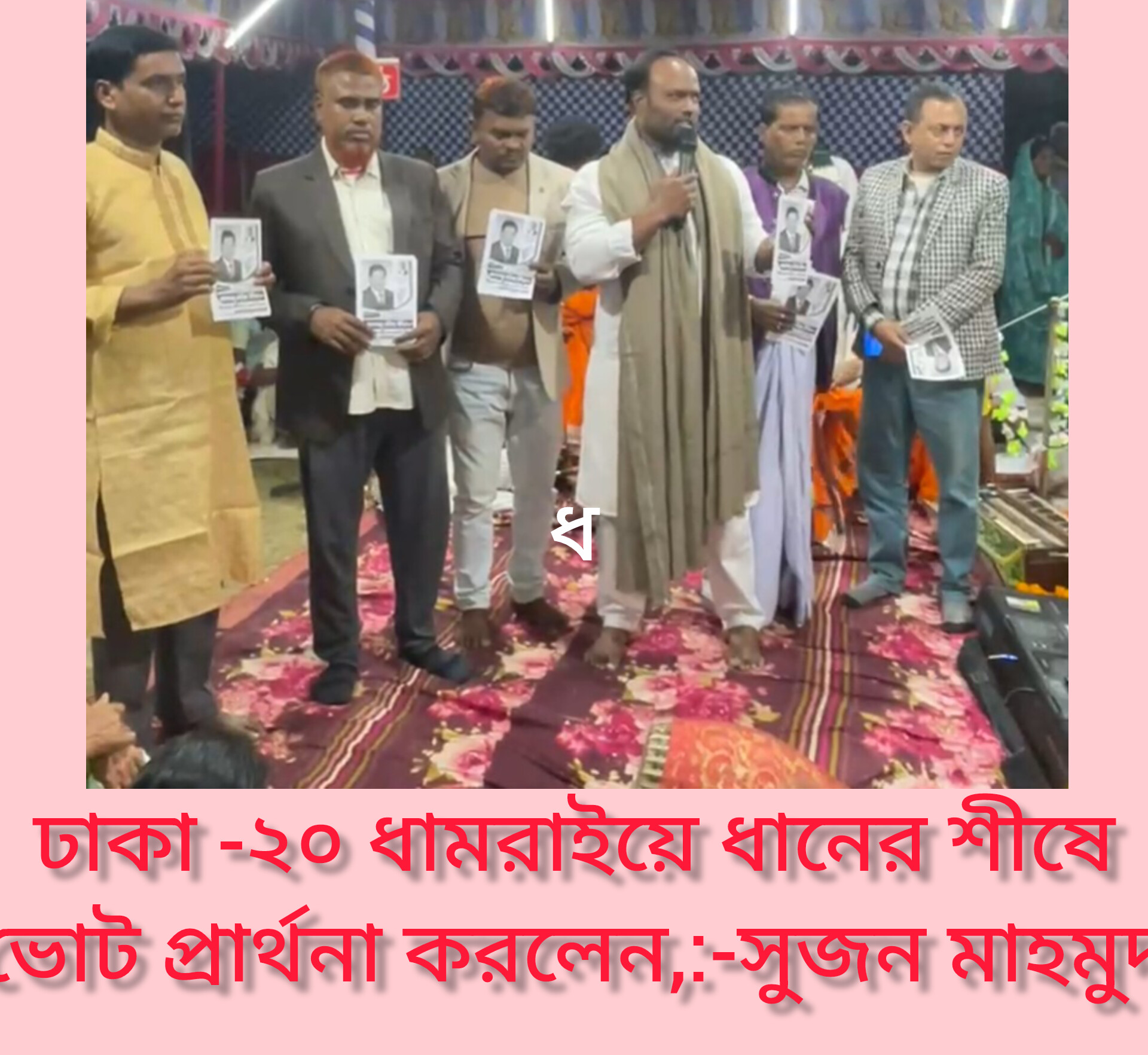 আসন্ন ত্রয়োদশ জাতীয় সংসদ নির্বাচনকে সামনে রেখে ঢাকা-২০ (ধামরাই) আসনে বাংলাদেশ জাতীয়তাবাদী দল (বিএনপি) মনোনীত প্রার্থী আলহাজ্ব তমিজ উদ্দিনের পক্ষে ধানের শীষ প্রতীকে ভোট চেয়ে গণসংযোগ করেছেন ধামরাই উপজেলা স্বেচ্ছাসেবক দলের সদস্য সচিব সুজন মাহমুদ।
