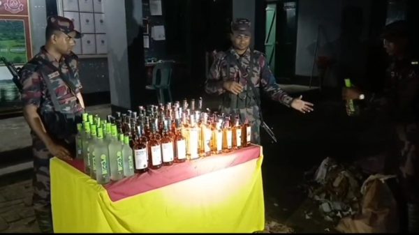 অভিযানে মালিকবিহীন অবস্থায় বিভিন্ন ব্র্যান্ডের ভারতীয় মদ ১০২ বোতল জব্দ করা হয়।