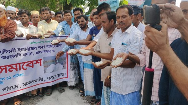 কক্সবাজার প্রতিনিধিঃ কক্সবাজার লবণের দাম কম পাওয়া ও বিদেশ থেকে লবণ আমদানি বন্ধের দাবিতে কক্সবাজারের মহেশখালীতে লবণ চাষি ও মালিকেরা সোমবার সকালে অভিনব এক প্রতিবাদ কর্মসূচি পালন করেছেন। তারা প্রধান